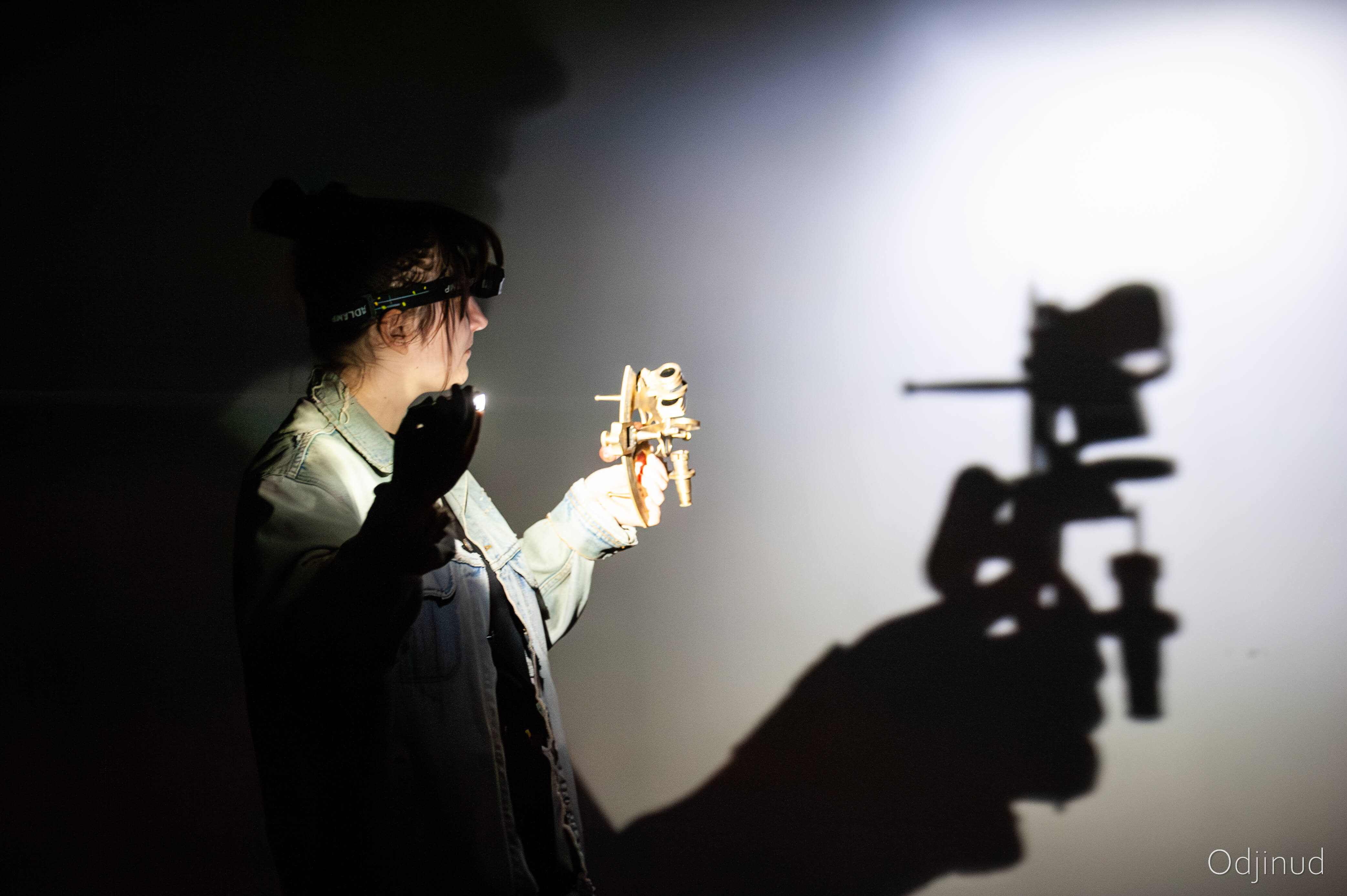 The piece ultimately unfolds as a network of associations around navigation, operating simultaneously on visual and auditory levels and creating unexpected connections. In one sequence playing with light and shadow, the sextant handled by Tytti Arola recalls, both in surface and silhouette, the French horn played by Elena Kakaliagou. Modern navigation also enters the frame: in one extended passage, the performers form a human flock that blindly follows the voice of a navigation system. The scene inevitably brings to mind the recurring news stories of drivers who end up stranded on ski tracks after trusting GPS instructions over their own senses.