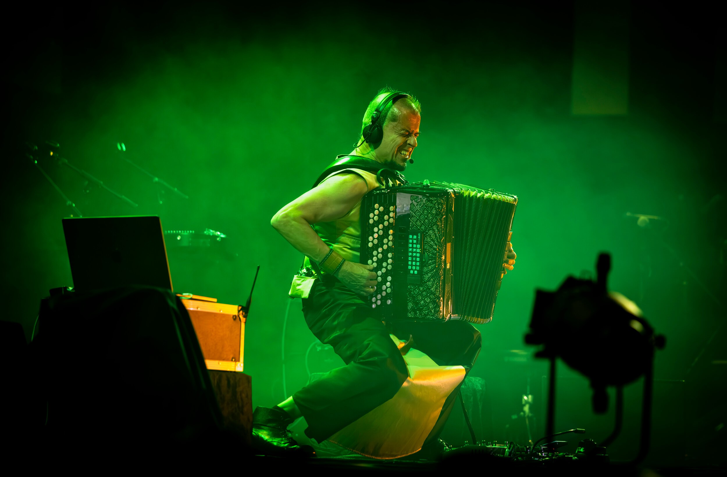 Kimmo Pohjonen has done a lot of concerts with looping and pre-recorded tracks, but this concert was all live: the videos and the percussive effects plus accordion and vocals, all triggered through the accordion. How it’s done, I don’t know, but he assures me everything is done live.